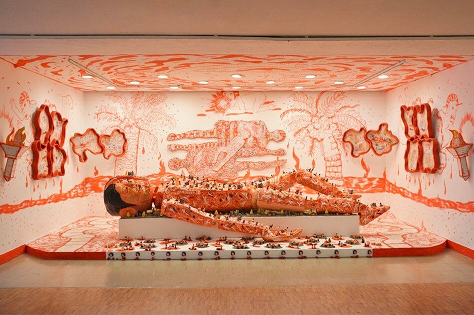 Puis on se mêle aux sons de Lagos à bord du « danfo » vieux minibus Volkswagen reconvertis en taxis collectifs très populaires, on déambule parmi les « Aliens of Manila », ces protubérances colorées réalisés à partir d’objets plastiques récupérés par Leeroy New (fashion week ici aussi), les peintures hyper réalistes des cyclo pousses de Dacca, on traverse la bad painting de Manille, on ingurgite des tonnes de porn food, on croise des zombies beaucoup de zombies, on ingurgite du sexe survitaminé, on danse sur des karaokés anarchiques, on suit des graffitis sales et flippants.. la nuit ne se pose jamais sur les tympans hypertrophiés de la jeunesse des villes-mondes.