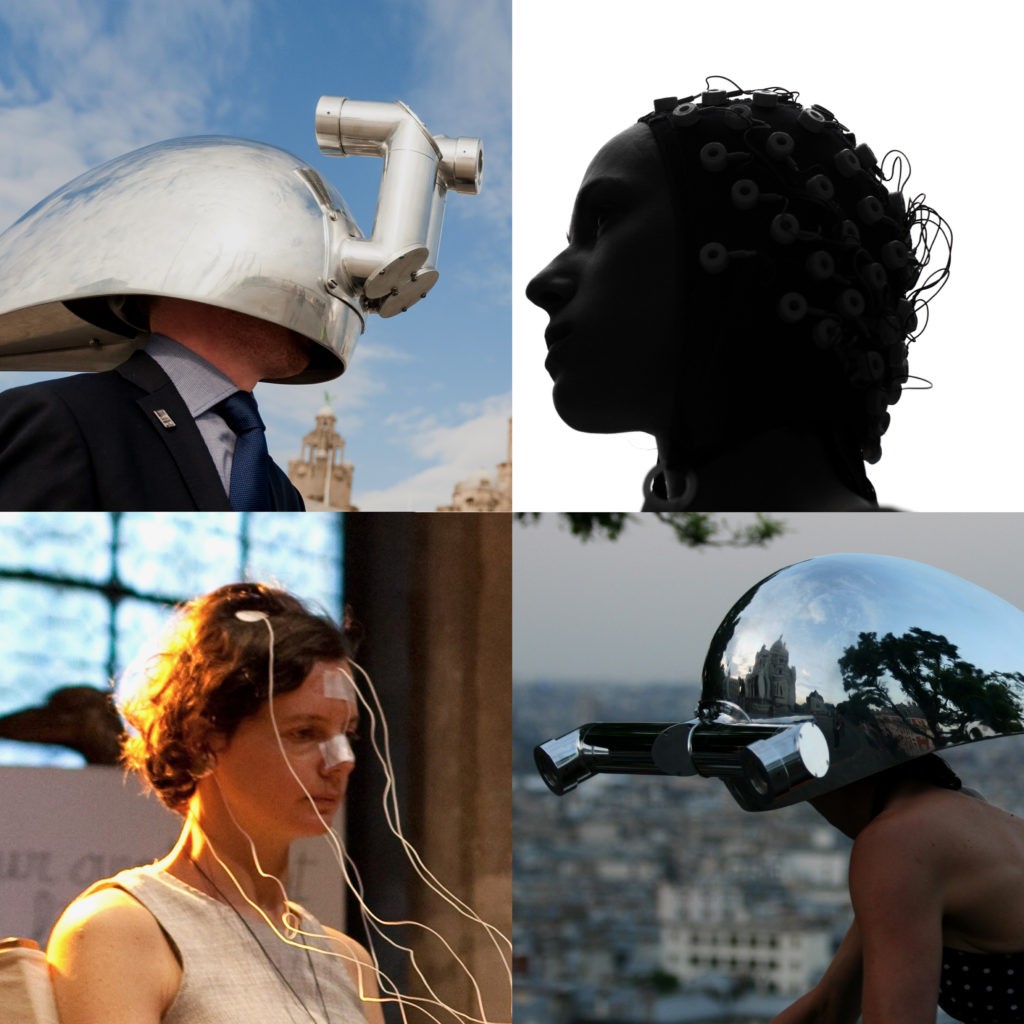 Grâce à des casques-sculptures, les deux artistes offrent de changer le point de vue sur le monde et d’adopter la vision d’un requin-marteau, d’un caméléon ou d’une girafe. Ou bien d’expérimenter le monde en pures couleurs, sans les contrastes et les ombres auxquels nous sommes habitués — ce qui bouscule la perception du mouvement. Leur ami et collaborateur Guillaume Dumas, chercheur en fonctions cognitives vous fera subir tout un tas d’illusions, aussi révélatrices que divertissantes.