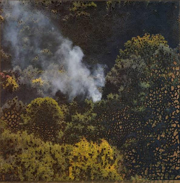 Si les œuvres de la série le Spectre partent d’une fumée blanchâtre, provoquée par un feu dans une forêt du côté de Grenade, elles évoquent plus l’idée de spiritualité que de désastre et de danger imminent. Pour Miguel Rothschild, c’est la question de la représentation, de la double lecture qui l’intéresse. Lorsqu’on regarde ces grands formats, on peut aussi bien y voir une brume matinale qu’une forme spectrale. Toutes les interprétations sont possibles. Ce qu’il tente de restituer, est de l’ordre de la métaphore de l’esprit de la forêt. C’est un paysage dans lequel on suit une forme spectrale blanche dans une forêt qui devient onirique par l’utilisation des brûlures. Toute la surface du tirage photographique est parsemée de brûlures de taille différentes créant un espace tridimensionnel où apparaissent des touches de couleurs évoquant une peinture. Par son action, extrêmement minutieuse, il compose une autre perception de la réalité. L’histoire de l’art et particulièrement le romantisme allemand, très présent dans l’œuvre de Miguel, depuis son installation à Berlin il y a plus de vingt ans, demeure une source d’inspiration constante.
