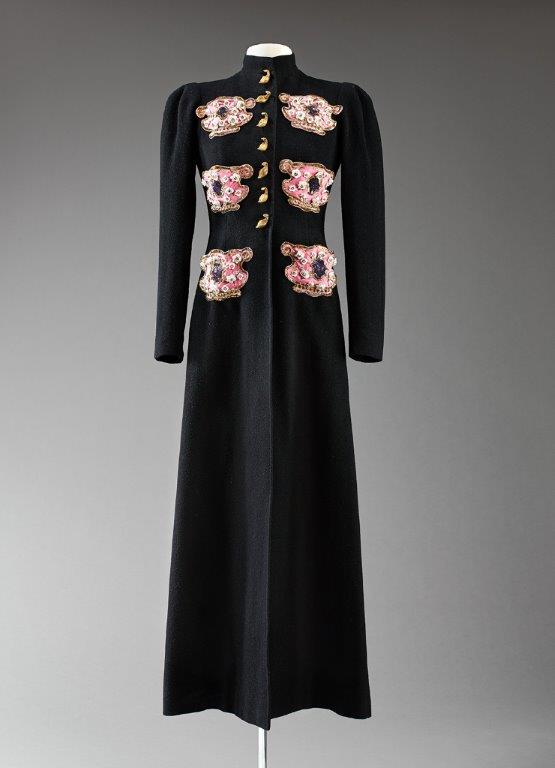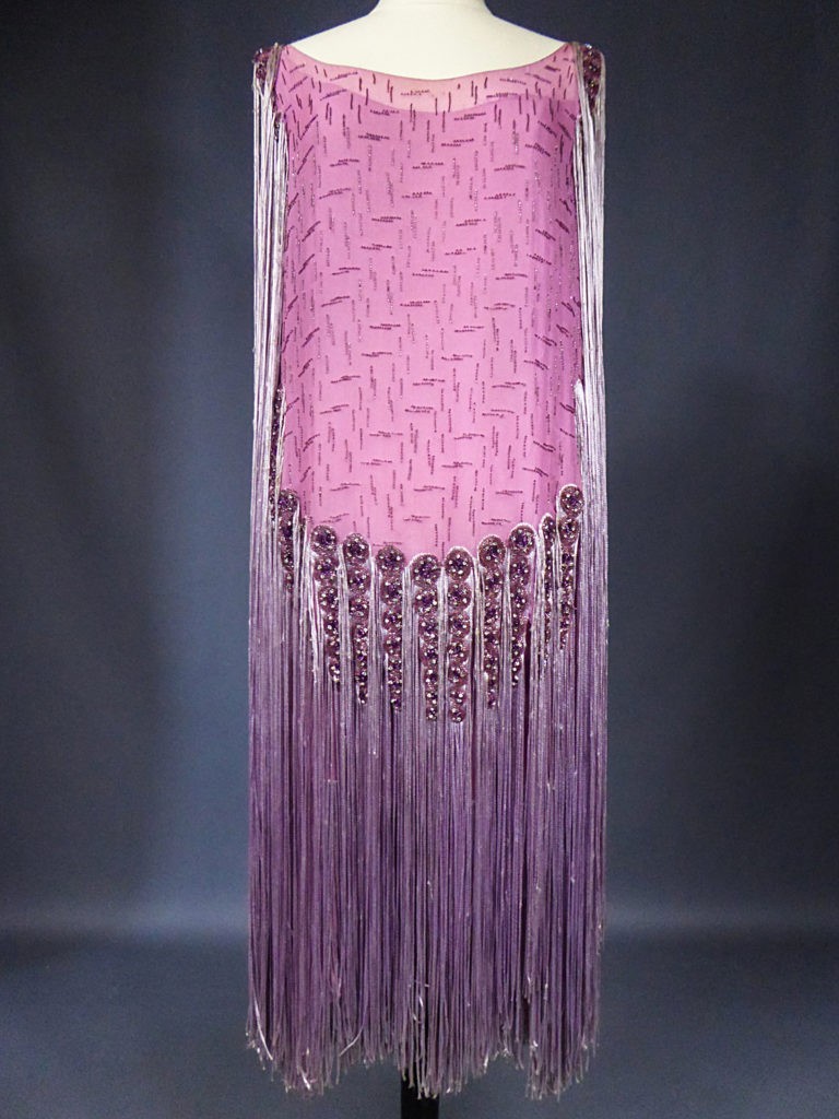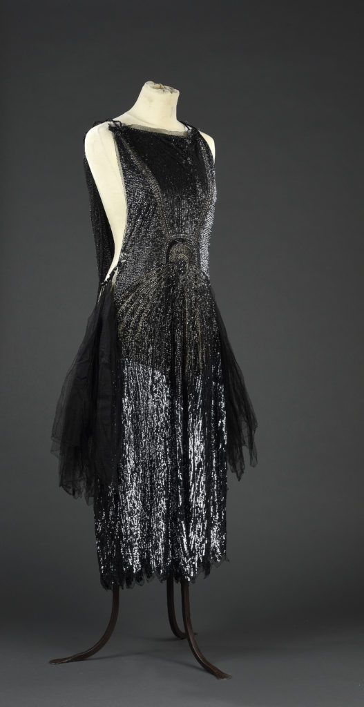 Dans une 1ère partie de l’exposition « Grand salon des années 1920 » nous présentons des pièces spectaculaires et toutes très novatrices avec les grands noms des couturiers Jean Patou, Chanel, Lucien Lelong, Lanvin, Paul Poiret, Worth, Callot Sœurs traduisant bien l’image de la garçonne des années 1920 qui se glisse dans une robe droite assez courte, voyante, sans entrave, pour pouvoir vivre à toute allure ! Au contraire des années 1930 traitées au 1er étage (Grand Salon des années 1930) où la mode est plus galbée, classique, très raffinée, comme chez Madeleine Vionnet qui avec le biais épouse le corps et imite les silhouettes inspirées de la Grèce classique. Pour aller vers le fantaisiste et le surréaliste avec Schiaprelli qui côtoie les membres du Surréalisme comme Man Ray, Cocteau, Dali… tout un milieu très créatif qui va apporter à la mode une fantaisie qu’elle ne connaissait pas.