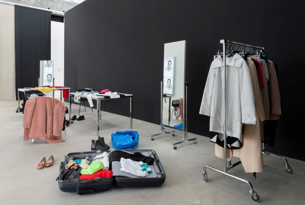 L’exposition « Same but different » se construit à travers des polarités ou des oppositions – le noir et le blanc, le positif et le négatif, le visible et le non visible, le champ et le hors champ. Une grammaire qui rappelle la photographie argentique de manière presque anachronique pour des œuvres récentes réalisées pour la plupart grâce à l’intervention d’outils numériques. Dans cette exposition, Alex Hanimann retient des images qui sont des moments : des condensés de gestes, d’histoires et de souvenirs. Il transpose les principes de la photographie dans différents médiums – vidéos, peintures ou installations – pour mieux percevoir les nuances et les écarts entre les images et la réalité. Il accentue la trame des images, répète, zoome et modifie parfois certains détails. Les œuvres imposent ainsi un nouveau rythme au regard. Elles invitent à distinguer entre les images que l’on habite, que l’on fabrique ou que l’on projette. Comment les images sont-elles incorporées ? L’exposition commence par un vestibule jonché d’habits et de divers accessoires. Le visiteur est comme un acteur traversant des coulisses. Au mur, quatre photographies d’identité sont agrandies et montées sur caisson lumineux. L’indice de leur manipulation souligne le jeu entre l’original et la copie. Elles renforcent paradoxalement le sentiment d’une absence, ici l’artiste puisqu’il s’agit d’autoportraits. Le corps du visiteur est, lui, pris à parti. Il rencontre différents flux d’images.