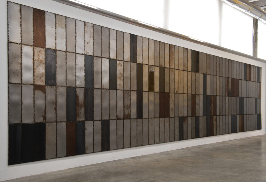 Kevin Rouillard (prix SAM pour l’art contemporain 2018) a su saisir pleinement l’espace, comme le souligne Thomas Bernard son galeriste à Paris. Avec « Le grand mur » réalisé suite à son voyage au Mexique la question politique est sous-jacente comme souvent chez lui dans un engagement qui va au delà d’une histoire familiale (son lien avec le Cap vert). Ainsi son univers de gestes à partir de bidons démantelés utilisés par des expatriés ou de tôles monochromes récupérées qu’il met en tension donne un récit alternatif à une réalité géo-politique brutale et violente.