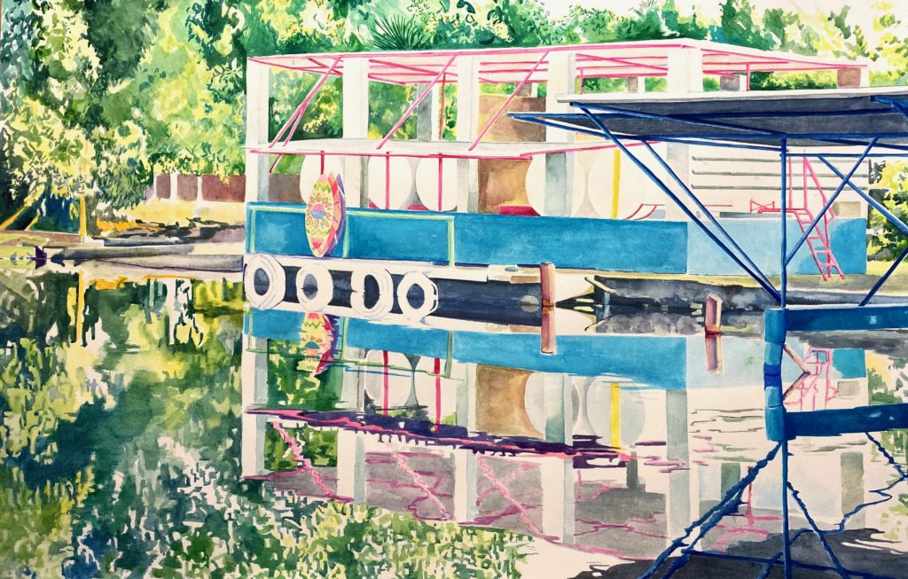 Je n’ai pas eu d’envie au départ, sinon de me demander où peindre pendant cette période. J’ai aménagé un atelier dans une grange à la campagne où je suis partie m’isoler en famille. J’avais une toile en tête depuis quelques mois que j’ai réalisé pendant cette période. Hasard ou coïncidence, elle représente une scène de l’attente… mais joyeuse. L’envie a donc été de prendre tout le temps nécessaire pour peindre cette idée. Le format de la peinture fait 145 x186 cm. C’est une maison, un petit habitat, clôturé, avec des chaises devant la porte. Les chaises sont vides. Les couleurs de la maison et des chaises sont peintes avec des couleurs pures : bleu, rouge, blanc, rose…Tout semble calme. On peut y lire sur la maison « Villa Armore – rooms available ». Peut-être dans l’attente de jours meilleurs, il fallait rester positif comme toujours. Elle s’intitule « Bonnes vacances ».