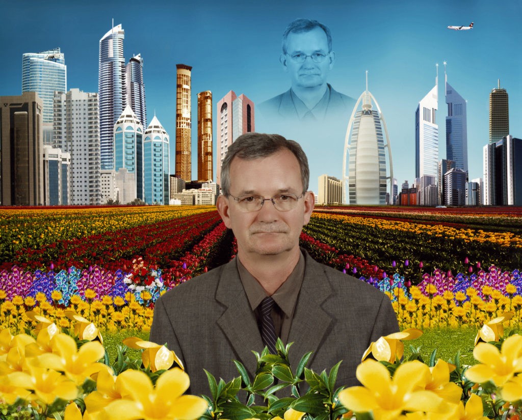 Le tourisme de masse est l’autre de ses préoccupations constantes dont la perche à selfie est devenue l’emblème. Curieux de revoir ses vues saturées de Venise ou des salles du Louvre quand on sort du vide du confinement ! Il y ajoute une touche très personnelle se prenant en photo lui-même lors de ses voyages dans la série « Self Portraits », endossant différents costumes (le cosmonaute aux côtés des chiens embarqués dans l’espace) ou uniformes (Vladimir Poutine).