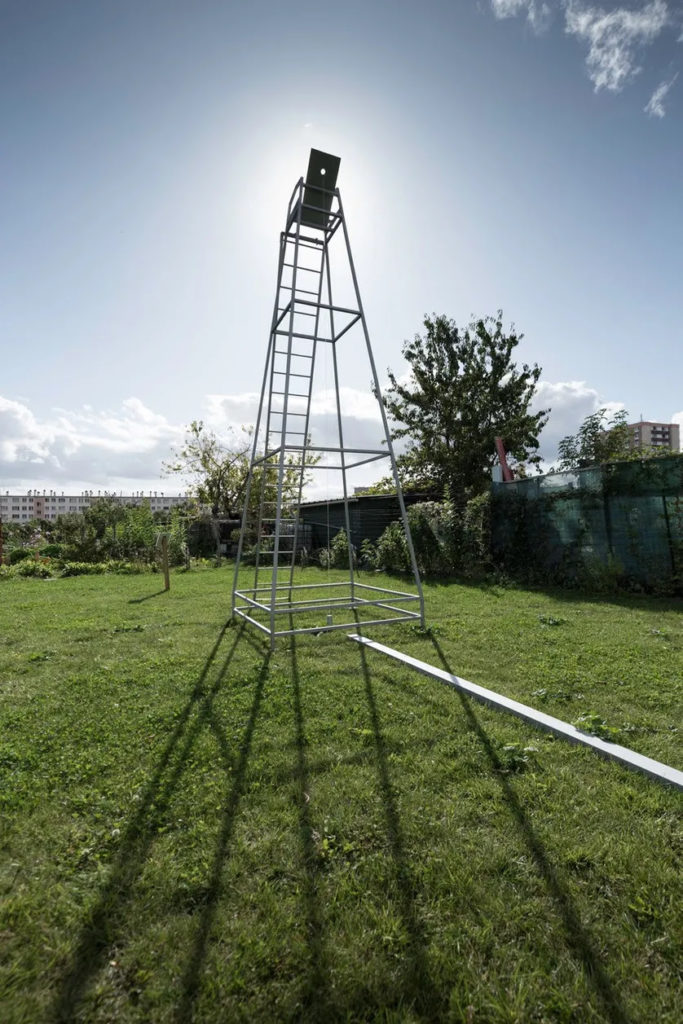 Lauréat de la bourse [N.A!]/Zone Sensible, Raphaël Dallaporta avec Méridienne  conjugue l’observation des astres et la pratique photographique à travers une immense chaise haute de plus de 4m50 inclinée vers le ciel et dont l’ombre permet d’esquisser une astronomie de terrain, à l’échelle de l’Espace 365. Célébrer l’équinoxe avec cette méridienne a tout son sens dans la dernière ferme maraichère en Seine Saint Denis. Redécouvrir l’art de tracer des cadrans solaires sous cette mise en forme minimaliste ajoute à la prétendue neutralité et rigueur de l’approche scientifique. Une dose de récit à la fois intime et universel que poursuit l’artiste dans ses expérimentations d’écriture de la lumière par différents protocoles qu’il met en place.