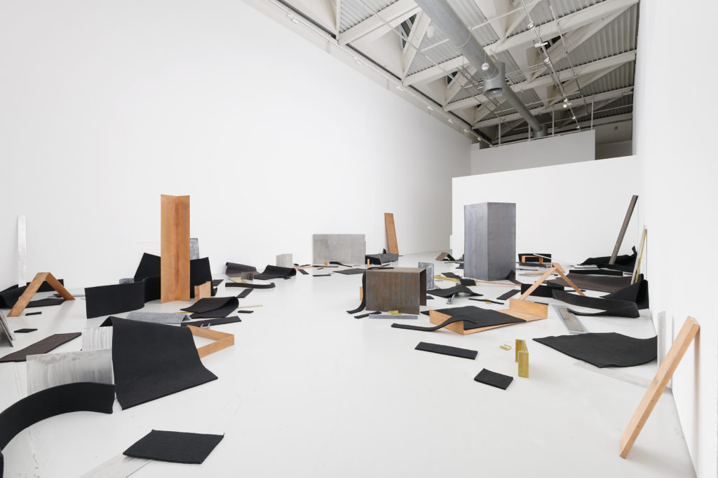 Sous formes de constellations le parcours s’arrête sur 13 sculptures et installations emblématiques des principaux questionnements mis en œuvre par Robert Morris : l’interaction avec l’espace, l’activation du corps du spectateur (le « corps perceptif » sous-titre de l’exposition), la déclinaison modulaire sérielle, la part de l’inattendu et de l’aléatoire. Il participe à l’exposition fondatrice « Primary Structures » de 1966 aux côtés de Dan Flavin, Carl Andre, Donald Judd et Sol Lewitt et théoricien, publie en 1967 « les notes sur la sculpture » dans la revue Artforum où il met à mal un certain nombre de prérequis et normes pures héritées du modernisme. Ces « formes unitaires » comme il les appelle, simples et les plus objectives possibles construites dans des matériaux bruts et utilitaires vont en fait révéler une dimension autre, sensible et anthropomorphique basée sur l’agencement, la taille et l’échelle du corps, sous l’influence des liens de Robert Morris avec l’univers de la danse expérimentale que pratique son épouse Simone Forti et la communauté new yorkaise de la Judson Church.