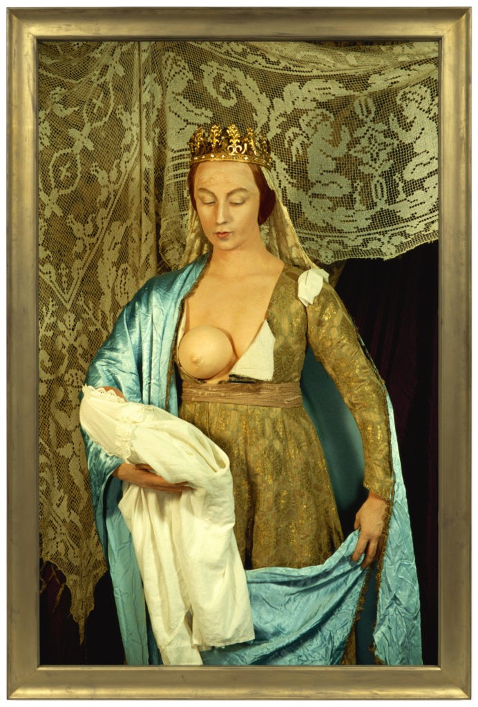Ces séries, que nous présentons dans un espace à part avec un avertissement préalable au public, sont très importantes dans l’œuvre de Cindy Sherman car tout d’un coup elle disparaît quasiment de l’image. C’est la première fois que nous montrons les deux séries ensemble. D’une part, les Sex pictures donnent à voir des mannequins et des prothèses médicales disposées dans toutes les postures érotiques possibles. Dans cette série, elle joue sur l’humain et l’inhumain dans le contexte du sida et d’une censure puritaine aux Etats Unis. D’autre part, les Fairy Tales/contes de fées présentent des scènes terribles où elle se sert aussi de prothèses pour se transformer en personnages monstrueux ou grotesques, en truie par exemple. Elle a cette dimension gore, trash, tragique et carnavalesque qui existe aussi dans la culture américaine. Elle est comme une sorte de Mary Shelley qui crée un personnage fait de morceaux épars. A propos de ces séries, elle dit aussi qu’elle en avait assez de faire de belles images que tout le monde achetait, comme les «History portraits» qui avaient beaucoup de succès, donc elle a décidé de changer de registre avec du dégueuli, du vomi que personne n’oserait mettre sur ses murs !