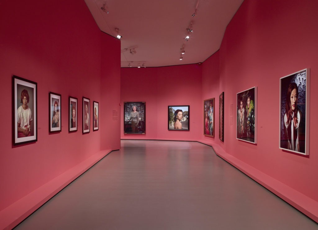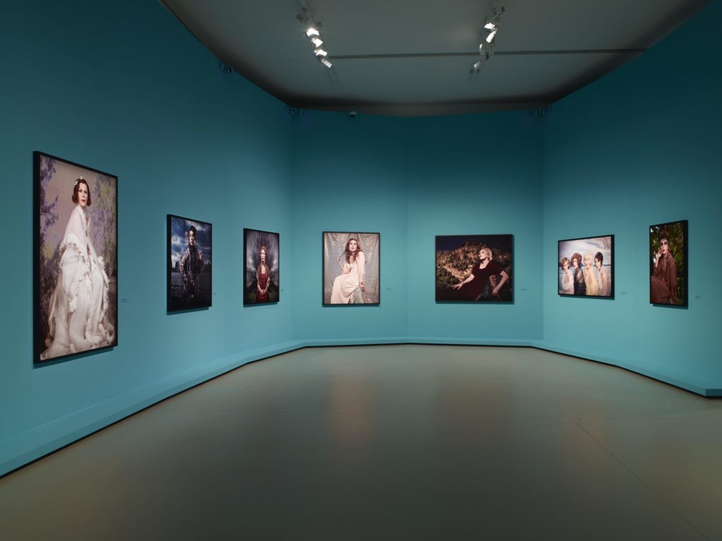 La scénographie se déploie comme un éventail aux multiples facettes, sur une idée de Marco Palmieri. Le scénographe, élève d’Ettore Sottsass, avait déjà travaillé pour la Fondation Louis Vuitton à l’occasion des expositions La Collection Courtauld ou Art Afrique qui témoignaient déjà de sa sensibilité aux couleurs. Il nous a proposé une maquette avec un dépliant formant des angles et intégrant des pans de miroirs. L’idée a tout de suite plu à l’artiste qui aime avoir de nouvelles présentations de son œuvre dans chaque lieu, que ce soit à Londres, Vancouver, New York… Les couleurs proposées par le muséographe ont été choisies avec l’artiste sur l’idée de la palette de maquillage. Cet effet de miroir et de démultiplication est en parfaite cohérence avec le travail de l’artiste, car le visiteur voit ses nombreux reflets au milieu des personnages fictifs et les photographies sont dédoublées, renforçant ainsi l’idée d’artifice. S’exposer, se regarder dans le miroir, s’y perdre, cela ajoute un effet supplémentaire à cette multitude de portraits que décline la rétrospective.
