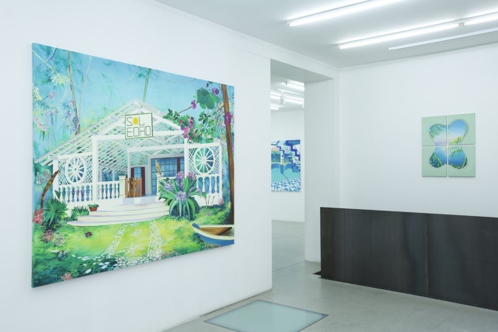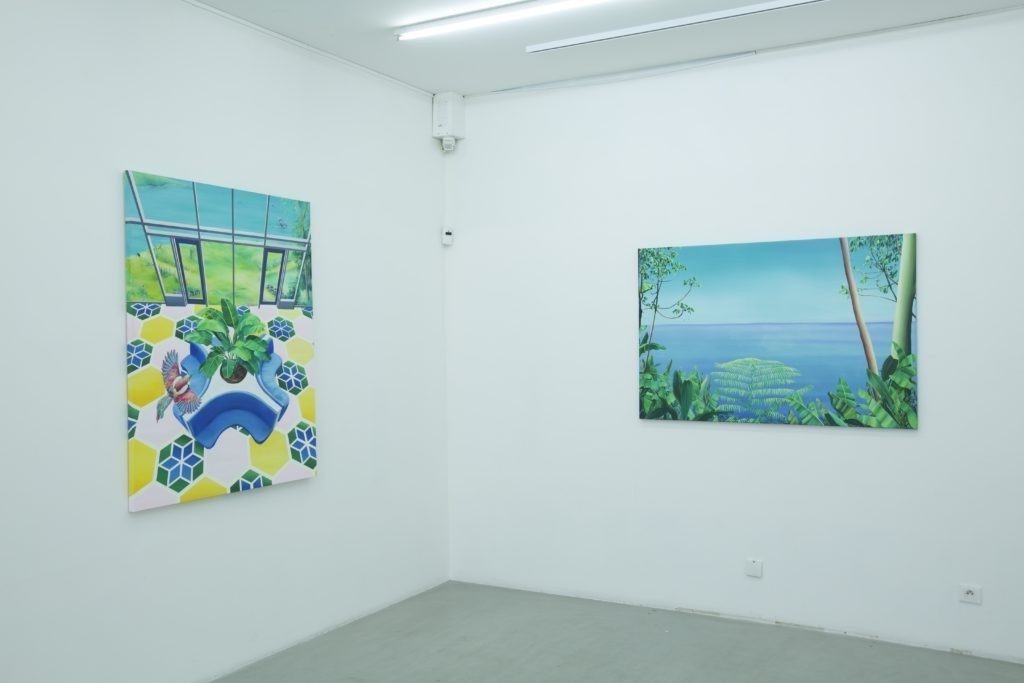 Dans ces véritables peintures-fenêtres, parfois littéralement, avec sa série des Cruising (2020), nous sommes invités à découvrir des terres inconnues qui apparaissent vite pleines d’oppositions. Un monde ordonné et architecturé, marqué par des lignes droites et de grandes constructions où les moindres détails sont minutieusement travaillés, s’oppose à une nature abondante, chaotique, qui semble souvent lui disputer l’espace, allant parfois jusqu’à faire basculer l’impression de calme vers un sentiment d’inquiétude latent. Ces espaces – I will rest there (2017), Like a bird (2017) … – rappellent alors ces lieux abandonnés à la hâte, avant l’arrivée d’une catastrophe soudaine.