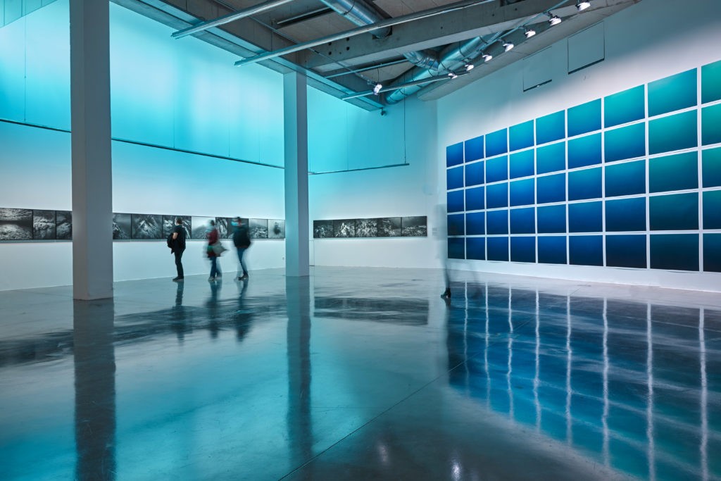 Lorsque je travaille sur des espaces assez conséquents j’aime me saisir de l’ensemble de l’espace et proposer comme une vaste installation qui connecte les plateaux entre eux sous la forme d’une véritable immersion en lien avec l’architecture du Frac. J’ai cherché à recréer des teintes d’eau sur les vitrages à partir de photos qui filtrent la lumière dès l’entrée du bâtiment. Les projets ont différents statuts et temporalités même s’ils s’inscrivent toujours au long cours. Le projet de Bretagne « Initium maris » qui a commencé en 2018 (avec des repérages avant) et « La couleur de l’eau » en 2016 se termineront en 2022, alors que le projet « Invisible » du Parc des Calanques est plus récent entre 2018 et 2020. Je montre des étapes de travail d’un côté et un projet abouti de l’autre, mais ces projets font partie d’une série qui est une sorte de synthèse de tout ce que j’ai pu faire auparavant, ce qui explique le choix de ce titre « Paysages productifs ».