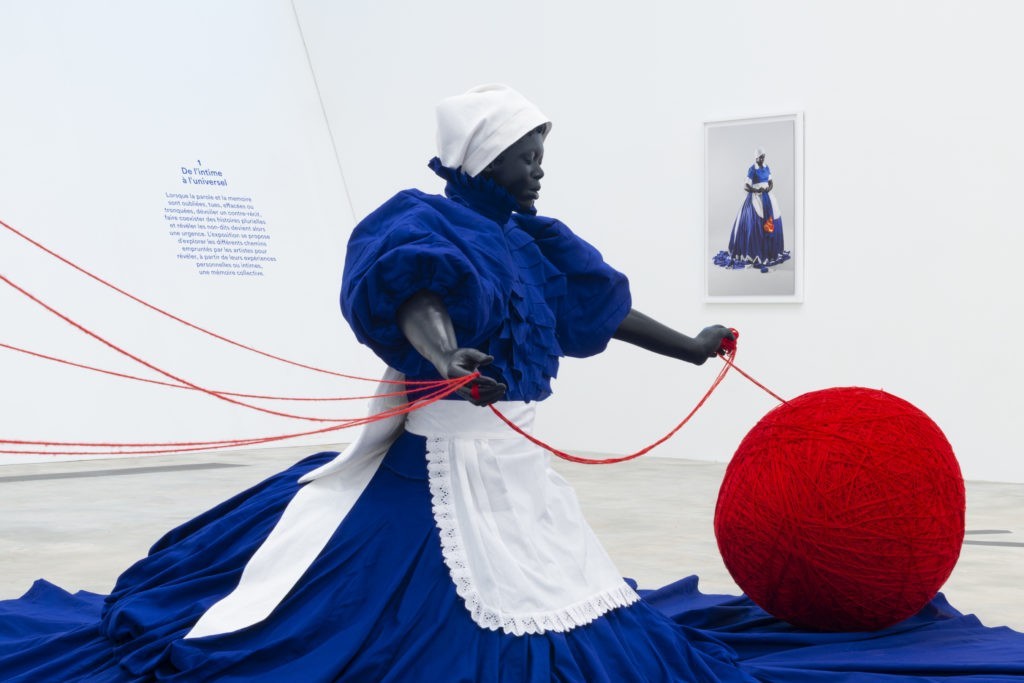 NH : L’œuvre de l’artiste sud-africaine Mary Sibande « Wish You Were Here » a une place particulière en effet dans le parcours. L’artiste se saisit de l’histoire de sa propre famille, une lignée de femmes fortes et courageuses au service des riches blancs sous le régime de l’apartheid à qui elle a veut rendre hommage en cassant cette fatalité. Cette sculpture à la taille exacte de Mary représente son alter égo qui évolue au fil de sa carrière d’artiste. Sophie est le nom que l’on donnait aux domestiques noires pour éviter d’avoir à utiliser leur noms sud-africains. Marie donne à Sophie un nouveau rôle et la place au centre de l’histoire comme détentrice du fil de cette narration, d’un rouge sanglant comme trace et résurgence de cette violence dans le présent. Elle porte une robe bleue qui symbolise cette période de l’apartheid (qui commence en 1938 et s’achève en 1991) et de style victorien. L’artiste donne une forme de majestuosité à Sophie qui garde pourtant ses attributs de servitude que sont le tablier et la coiffe blanche. Le fil de la narration, de l’histoire familiale et collective devient porteur d’espoir. Il mène à cette lettre S dessiné en héraldique qui évoque une sorte de mythologie. Ce S évoque les futurs, le prénom de Sophie, le nom de l’artiste mais aussi Superwoman comme cela est explicité dans la photo où l’on perçoit à travers son regard non pas la revanche ou la recherche de coupables mais une volonté d’apaisement. Si elle a conscience de ce passé, Sophie/Mary a également conscience de sa capacité à réécrire l’histoire et la suite du récit.