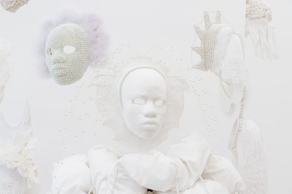 NH : Aux côtés de Mary Sibande, l’artiste zimbabwéenne Georgia Maxim reprend également cette question de l’intime et de l’universel à travers la pratique du textile à partir d’une malle de vêtements qu’elle a reçue à la mort de sa grand-mère. Plaçant la vie de ses aïeuls et de ses proches au centre de son œuvre, elle souhaite que cette histoire personnelle et collective s’inscrive dans l’histoire de l’art. Elle se saisit de la couture comme d’un pouvoir qu’elle accepte et transforme en une forme d’injonction. De même avec Enam Gbewonyo dont les œuvres sont montrées pour la première fois en France qui investit lors de performances le bas nylon couleur chair, objet intime chargé d’invisibilisation. Cette symbolique du bas nylon est reprise par Myriam Mihindou avec une grande force dans sa performance filmique La Robe envolée.