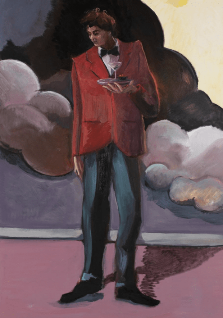 Dirty Martini comme la plupart de mes peintures est venue d’elle-même en quelque sorte n’ayant pas à dessein de représenter une image. J’ai en revanche le désir de représenter une peinture la plus proche et fidèle possible de ce qui me traverse. Dirty Martini est devenue la cristallisation de plusieurs émotions vécues et dès ses débuts entre janvier et février 2020. Elle me préoccupait en réalité depuis New York et à mon retour en décembre 2019, cette image était déjà sous-jacente. Elle raconte beaucoup de choses qui ne m’étaient pas familières et je pense qu’il m’a fallu plusieurs mois pour l’appréhender globalement à la fois dans mon travail et aussi dans ma vie d’alors. Il révèle un dandysme d’une flamboyance crépusculaire, avec cette forme d’incendie qui se dégage derrière ma silhouette dans des volutes de fumée très menaçantes. Comme un fantôme de cocktail, le Dirty Martini étant ce cocktail extraordinaire que l’on boit à l’incontournable Bemelmans Bar de New York et qui tape franchement sur le système ! En peignant cette peinture je devais traverser un certain nombre de choses assez limites entre 2019 et 2020. C’est un autoportrait qui dépasse ma simple figure puisque je m’attache à représenter ce à quoi je vibre. L’ensemble de ma démarche fonctionne ainsi entre une nécessaire distance et écoute de moi-même, entre un état de veille, d’intuition et de révélation.