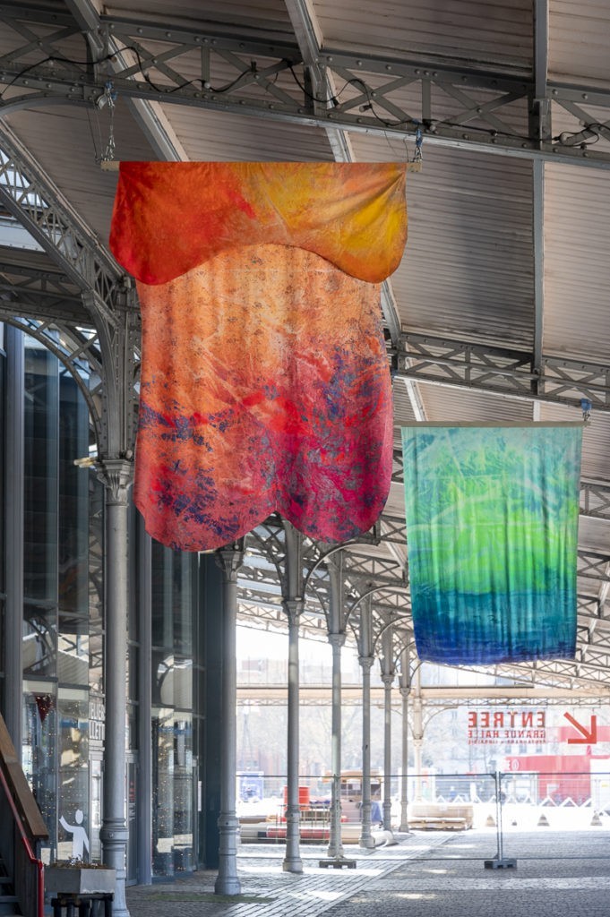 Charlotte Denamur (ENSBA Lyon et Paris) que j’avais repĂ©rĂ©e Ă la 15ème Biennale de Lyon (Jeune CrĂ©ation internationale, IAC Villeurbanne). Ses aplats colorĂ©s semblables à « des continents de couleur » sont ici suspendues en hauteur sous le pĂ©ristyle de la Grande Halle. Une rĂ©ponse in situ assez magistrale !