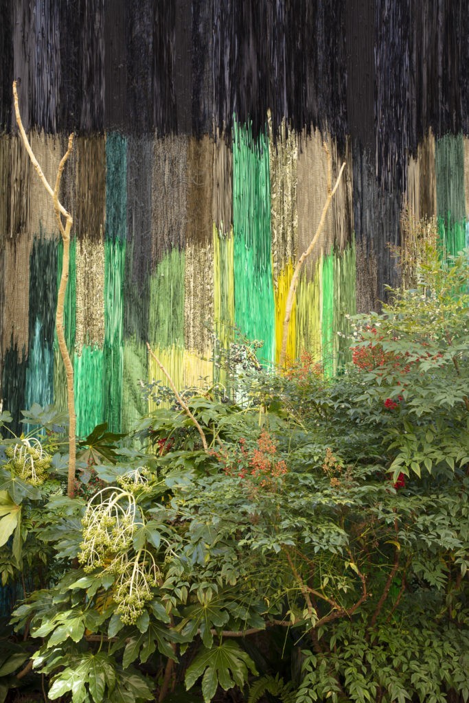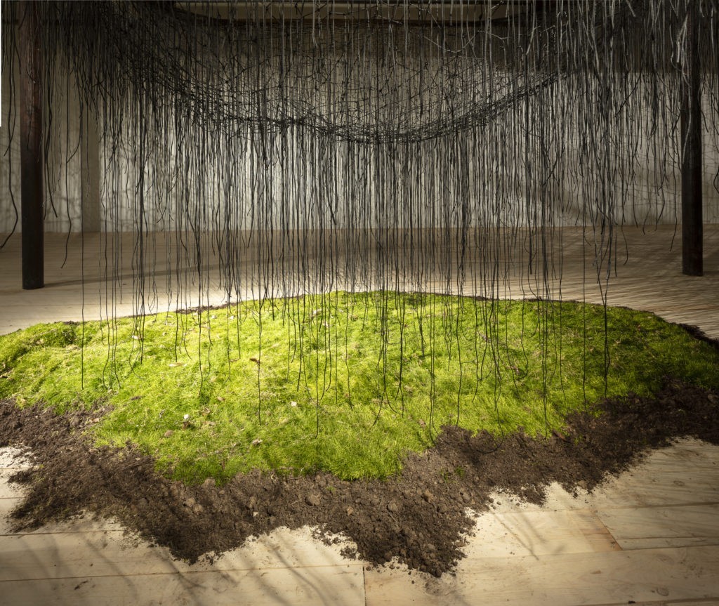 Que ce soit, en effet, les fils de laine et de soie de Sheila Hicks, les fils tissés de Chiharu Shiota, les fils de fer barbelé d’Abdul Rahman Katanani (parc), les fils qui soutiennent les œuvres de Chris Drury ou de Carole Solvay, je me suis aperçue a posteriori de ces liens inconscients, comme pour chaque saison. Ces résonances, ces ramifications souterraines, quand elles se matérialisent, sont toujours fabuleuses.