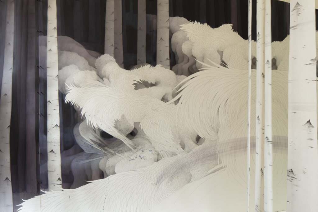 Il est important que l’on présente à la fois des artistes seniors comme Sheila Hicks, des artistes qui ne sont plus avec nous comme Dubuffet et Rebeyrolle, dont je voulais montrer le travail depuis longtemps et des artistes très jeunes. Chaque année, j’accueille des artistes émergents. et Je me souviens, par exemple, de l’artiste Duy Anh Nhan Duc d’origine vietnamienne, qui avait su transformer l’espace de l’Asinerie en un vaste champ éphémère de  milliers de pissenlits, une œuvre à la fois fragile et au pouvoir de réminiscence très fort. Cette année, la jeune génération est représentée par Fabien Mérelle, François Réau et Min Jung-Yeon (Galeries de la cour Agnès Varda), dont les dessins multiples nous entrainent dans des fictions sensibles et immersives.