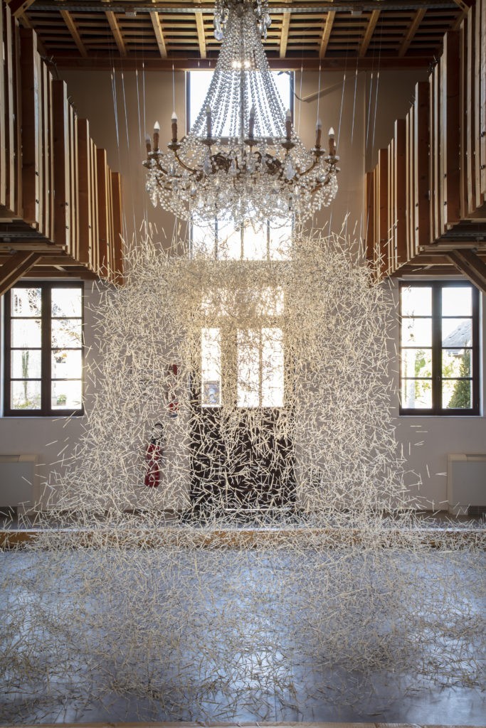 « Il est essentiel pour moi de créer l’émotion et l’émerveillement du visiteur » nous déclare Chantal Colleu-Dumond, en cette chaude journée d’avril où nous découvrons avec bonheur la nouvelle Saison d’art de Chaumont-sur-Loire. Malgré le contexte et l’incertitude qui pèse sur les lieux culturels, la directrice du Domaine de Chaumont-sur-Loire a maintenu l’exigence, entourée d’une équipe soudée et ultra motivée. Cela se ressent dans les moindres détails de l’accueil et du parcours. En une seule journée, le visiteur est invité à traverser les époques et les continents, autour d’artistes inscrits dans l’ADN de Chaumont ou d’autres nouveaux arrivants. Que l’on soit amateur de parcs et jardins, d’art contemporain ou de patrimoine historique, chacun y trouve une oxygénation bienvenue ! Une utopie à vivre où l’étonnement le dispute à la magie face aux cristallisations alchimiques de Pascal Convert (château et parc), aux arborescences de milliers de plumes de Carole Solvay (Asinerie), aux nuages atmosphériques de François Réau (galeries cour Agnès Varda), aux accumulations matiéristes de Paul Rebeyrolle (château), aux nuages d’épines et de lichen de Chris Drury (grange aux abeilles), aux rhizomes tissés de Chiharu Shiota (galerie du Fenil) ou à la grande tapisserie de verdure de Joël Andrianomearisoa (cour Agnès Varda). La promenade se poursuit dans le parc où l’on découvre les nids de fils de fer barbelé d’Abdul Rahman Katanani « Renaissance », les souches échappées de Verdun de Pascal Convert « Ceux de 14 », matrices de la mimesis chère à Georges Didi-Huberman, compagnon de pensée de l’artiste, et bientôt la conque de céramique colorée de Miquel Barceló. Autant de fabriques, terme consacré au XVIIIème siècle, rendues possibles par la volonté de Chantal Colleu-Dumond, qui se dit animée d’une force de résilience. Elle a répondu à mes questions avec la conviction qu’on lui connaît, alors que l’hôtel du Domaine sera ouvert l’année prochaine, si tout va bien.