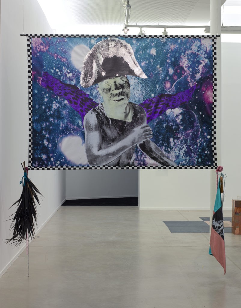 La créolisation des images, l’Afro futurisme, les figures de représentations de pouvoir et d’autorité traversent sa pratique textile et avant tout picturale dans des jeux de collages et d’interférences entre l’histoire du portrait de cour et des références iconographiques plurielles. Le politique est sous-jacent mais jamais imposé.