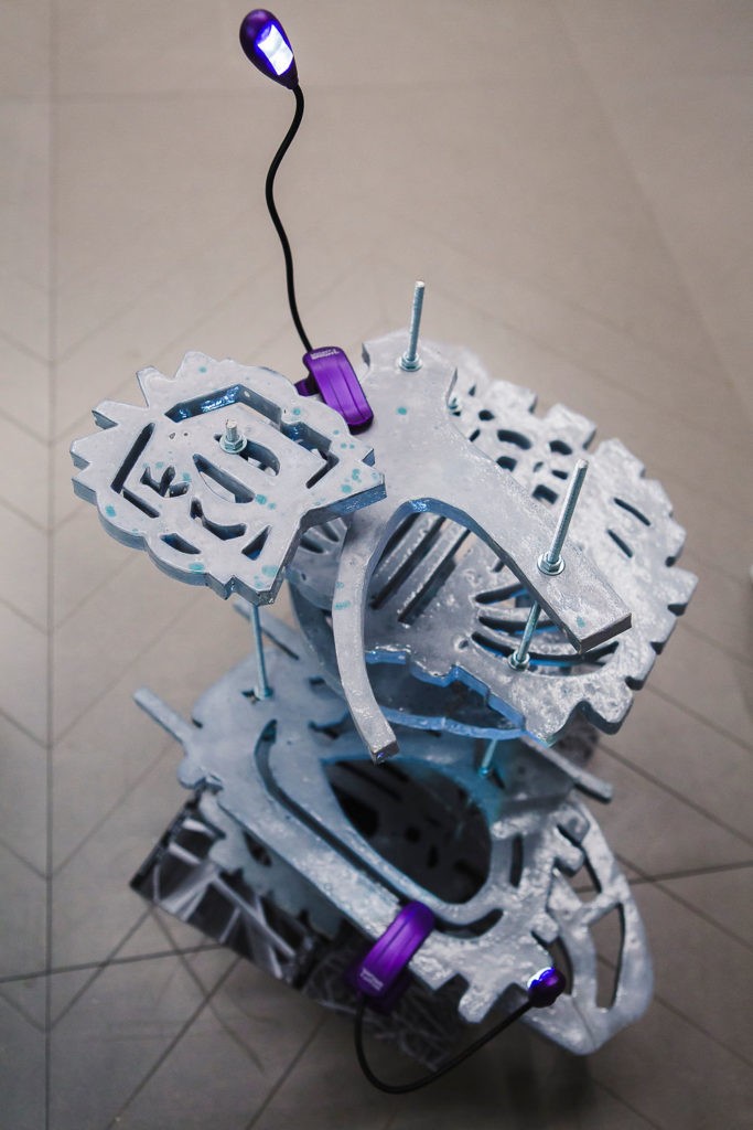 Plusieurs œuvres sont en cours à l’atelier en ce moment, surtout des “tableaux”, des bas-reliefs, alliant comme à mon habitude, transparence, images issues de mes banques de données, mises à jour quotidiennement, dessins géométriques, un mélange de gestes intuitifs et d’autres, beaucoup plus algorithmiques. De nouvelles sculptures apparaissent aussi, surtout en fibre de verre, mais toujours augmentées d’objets manufacturés. Je travaille aussi sur des sculptures plus monumentales prévues pour l’espace public.