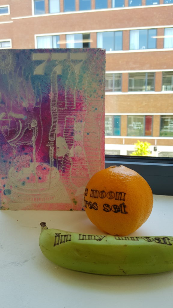 Autre élément important du parcours : tous les fruits (mangues, bananes, kakis, grenades…) constituent une même œuvre, éphémère mais reconductible selon un protocole précis. Sur ces 32 fruits sont gravés au laser les mots de la poétesse Audre Lorde, militante noire lesbienne qui nait dix ans avant Angela Davis. Ce même principe est décliné sur une autre œuvre à partir de coquillages sur lesquels on retrouve d’autres tatouages empruntés à la poétesse Maya Angelou, une autre écrivaine militante noire américaine.