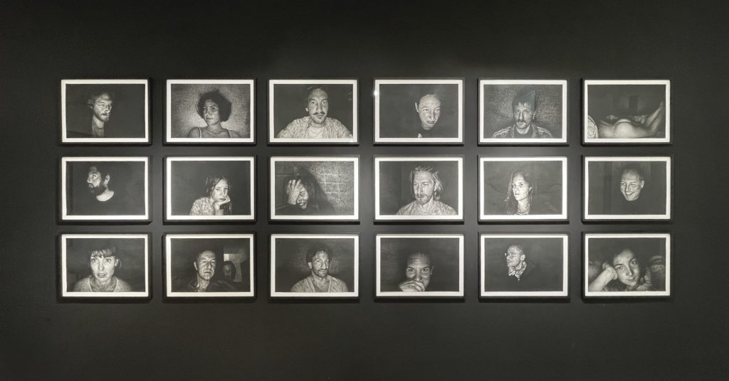 Je l’avais découvert lors d’une édition Drawing Now au Carreau du Temple grâce à la galerie Backslash. Personnalité haute en couleur très sympathique, Thomas Lévy-Lasne y proposait une installation immersive sous la forme d’ une grande forêt peuplée de fêtards un peu décalés au milieu des canettes de bières et des bouteilles. « Fragilité » cèdait le pas à « L’asphyxie » cette fois à la galerie des Filles du Calvaire autour de peintures proches de la catastrophe dans une sorte de jungle. Comment habiter le monde ? tel qu’il le résume. A présent sa nouvelle série de fusains créée pendant le confinement part du halo lumineux si présent sur nos écrans et nos visages captifs qu’il a saisit dans une palette de gris virtuose.