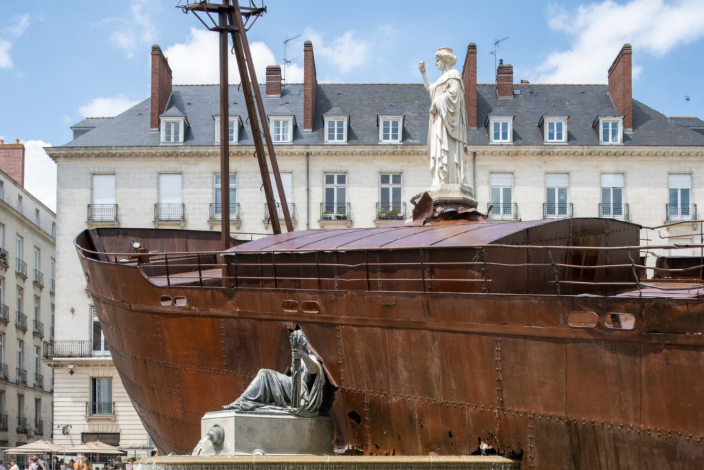 Déjouant l’allégorie portée par cette fontaine où Amphitrite apporte la richesse à la ville, il se saisit d’une immense épave de bateau de commerce (Nantes et ses routes coloniales) télescopant ainsi les imaginaires et projections. D’une grande force plastique, ce gigantesque collage a été un tour de force comme nous l’explique l’artiste. Du triomphe d’Amphitrite nous basculons à la déliquescence programmée de Neptune, son époux, depuis la passerelle Schoelcher, échoué et soumis aux altérations des éléments naturels. Diplômé de la Villa Arson et représenté par la Double V gallery, Ugo Schiavi lors de sa carte blanche au Musée d’Orléans avait revisité ses réserves de sculptures et lors de la Nuit Blanche de 2018 relu les soulèvements de Paris à partir de fragments de la Place de la Nation et Place de la République.