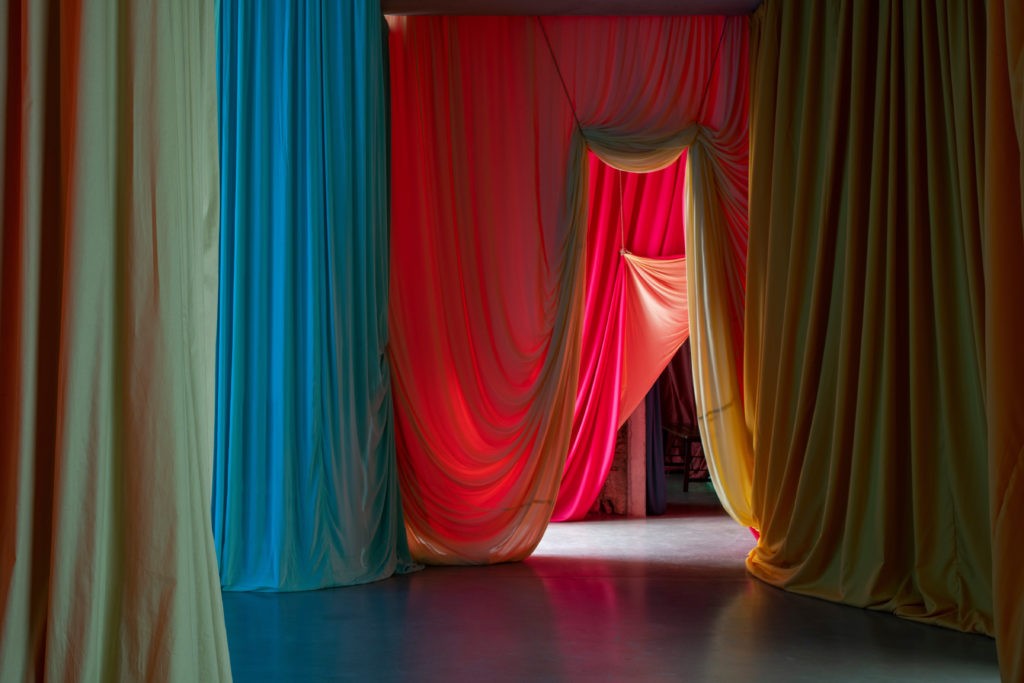 Ulla von Brandenburg, signe une proposition envoutante, Passage Sainte-Croix, lieu du patrimoine de la ville au cœur d’un ancien prieuré. Ombres bleues et jaunes est un théâtre de la performance et de la déambulation au milieu d’un patchwork de couleurs, formes et de lettres réalisé sur de grands pans de robes ou de voiles selon l’interprétation de chacun. L’artiste allemande, vivant en France formée à la scénographie a été nommée Prix Marcel Duchamp en 2016. Elle avait su magnifier l’agora du Palais de Tokyo pour sa réouverture en 2012 et revenir en 2020 pour une exposition monographique d’une grande cohérence et poésie.