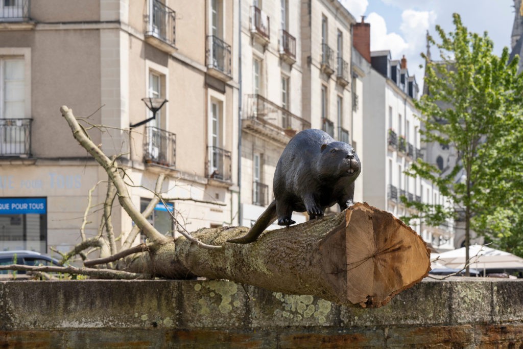 Laurent Le Deunff à partir de ce vestige archéologique de la Porte Sauvetout qui surgit sur le tracé du tramway avec « Un castor sur un arbre couché » opère un autre glissement entre le bronze et le bois, son matériau de prédilection habituel. Ce castor à la queue de poisson inspiré d’un traité de médecine du Moyen Age rend visible cette irruption de la nature dans l’espace urbain, l’un des phénomènes de cette période de confinement. Longtemps pourchassé, il est l’un des éléments clés des écosystèmes forestiers.