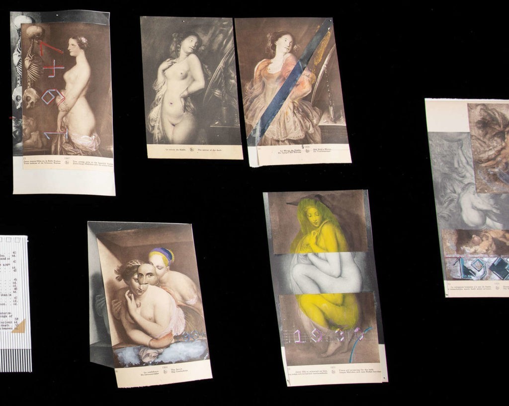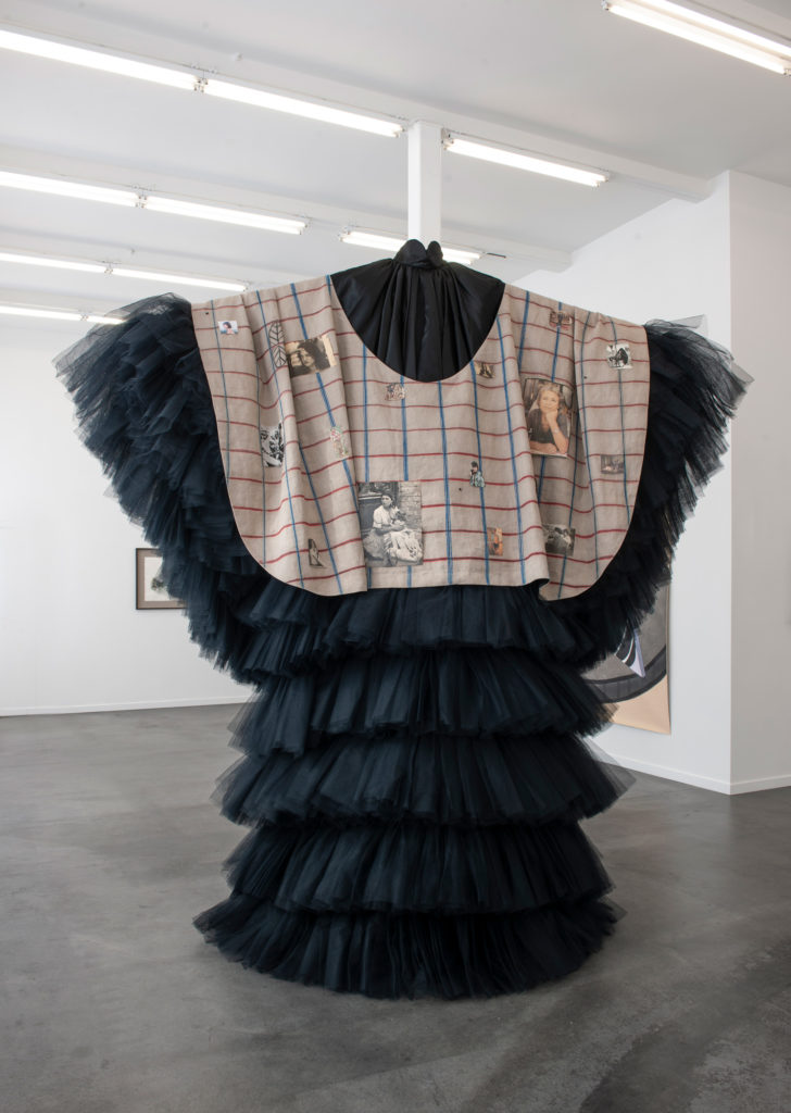 Textile, newspaper cutouts, canvas, wire, metal, glass courtesy the artist, Bernier Eliades