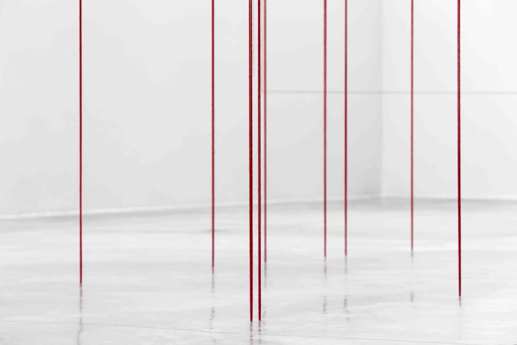 Changement de décor avec la Fondation CAB qui accueille un projet spécifique de Fred Sandback. Ses sculptures minimales sont toujours une réponse au lieu et la lumière naturelle de la verrière jouent un rôle important ici. Comme me l’explique Elenore de Sadeleer le défi a été de faire entrer un grand triangle « brisé » entre le seuil de la fondation et la salle suivante dans l’illusion d’une continuité. Comme une partition musicale, les couleurs et matériaux dessinent une chorégraphie à nulle autre pareil. A la recherche de la forme pure. La Fondation CAB dans le cadre de son programme de résidences accueille actuellement l’artiste français Nicolas Chardon.