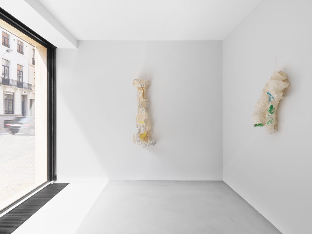 Xavier Hufkens avec Lynda Benglis Noeuds et nus, sculptures murales tubulaires en papier et un grand bronze doré réfléchissant. Dans des tons couleur chair, ces sculptures récentes portent la trace de leur processus de fabrication et métamorphose. Récemment exposée au Centre Pompidou dans le cadre de « Elles font l’abstraction » on connait l’artiste pour ses positions radicales et féministes.