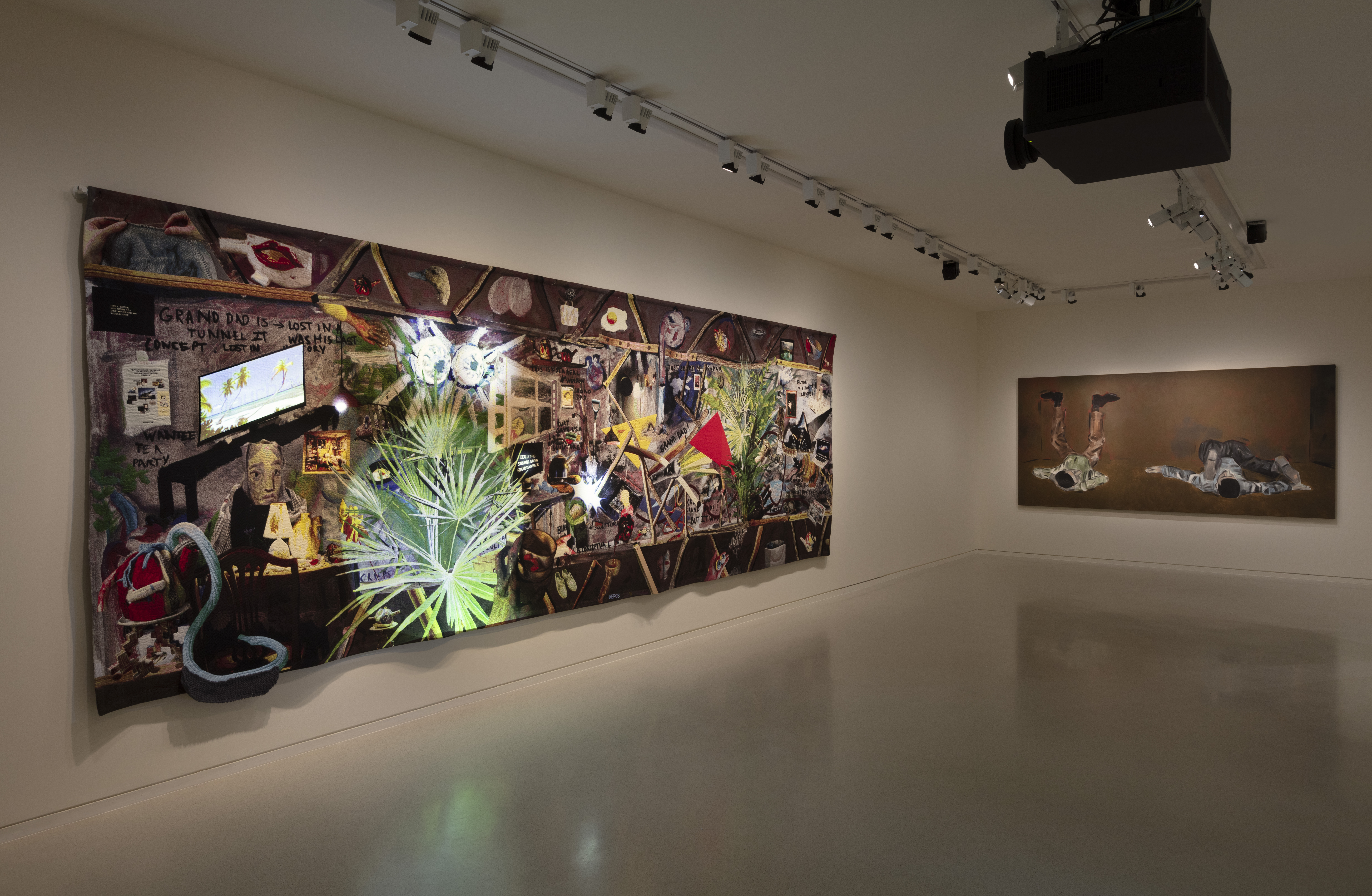 Ensuite, c’est un étage que je voulais plus silencieux, plus méditatif. Il y a toujours la question sous-jacente de l’exotisme puisque l’on arrive sur le palier avec cette forêt de cactus de Katinka Bock que j’ai choisi de mettre en dialogue avec une peinture de Latifa Echakhch qui s’inscrit à présent dans une série qu’elle a véritablement initié à Monaco autour de la notion de jardin exotique. Que nous dit cette carte postale de Monaco d’une nature artificiellement créée au sein d’une peinture sur béton qui s’effrite en référence à la rocaille ? Je trouvais cela intéressant cette mise en regard avec les cactus en bronze de Katinka Bock qui contiennent à la fois cette matière en fusion et les cendres du cactus consumées, la chair étant encore présente. Ces œuvres dialoguent avec une sculpture de l’artiste Hans Schabus, évoquant le voyage. Le voyage et l’exotisme sont deux thèmes essentiels dans l’œuvre de Laure Prouvost, dont on présente ici une tapisserie tissée par sa grand-mère fictionnelle.
