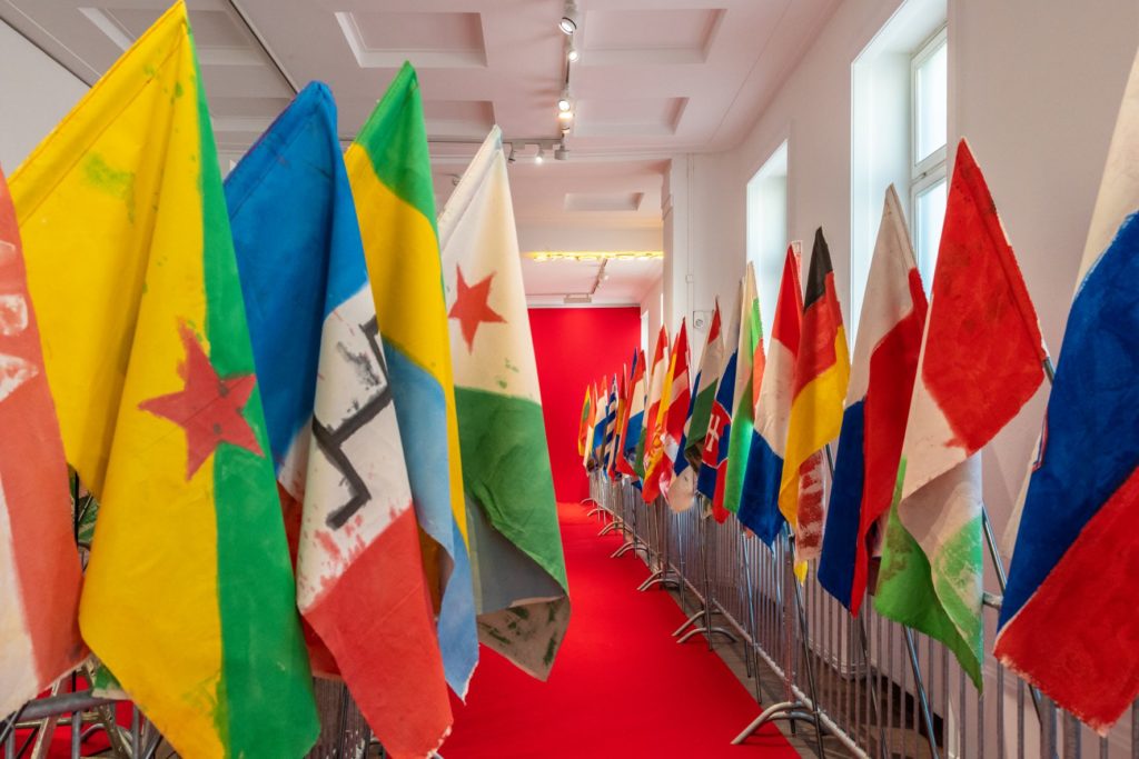 KM & PP : Kevin Muhlen nous avait donné la possibilité d’investir la totalité du Casino et ce n’est pas par manque d’envie mais nous souhaitions ouvrir et partager la parole avec d’autres. Le collectif Richtung22 est constitué de jeunes adultes ou adolescents qui ont décroché des plaques de noms de rues associées à la colonisation et ils les ont apporté au Casino pour lancer une discussion. Cette réflexion sur la colonisation ou plutôt la post-colonisation existe dans l’exposition avec l’installation des drapeaux mais elle interviendra aussi lors du finissage, qui sera un véritable pillage festif, accompagné par la musique de Shafi Badreddin, compositeur syrien qui vit au Luxembourg.