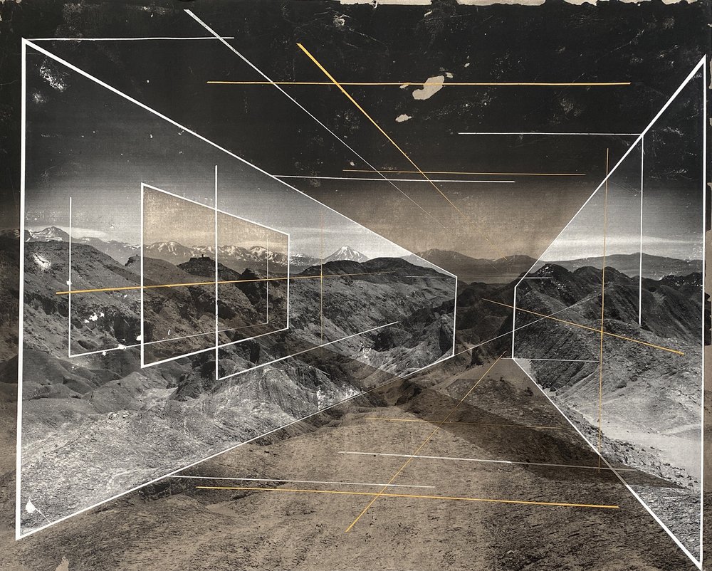 Valenzuela creates his landscapes by transferring printing toner onto raw canvas, a laborious process made evident by the wear and tear of the material. For the artist, this technique mimics that of photocopies and is a metaphor for the arduous bureaucratic procedures that immigrants must endure.