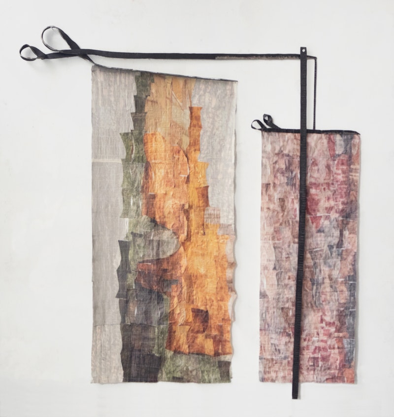 Pauline-Rose Dumas associe l’univers du textile à celui de la forge, deux approches a priori très éloignées entre sphère domestique et art du feu. Les étoffes se voient alors soclées ou retenues par ces apendices de métal dans des jeux de contrastes rehaussées par les motifs textiles issus de photos macroscopiques de textures dilués ensuite par impression digitale.
