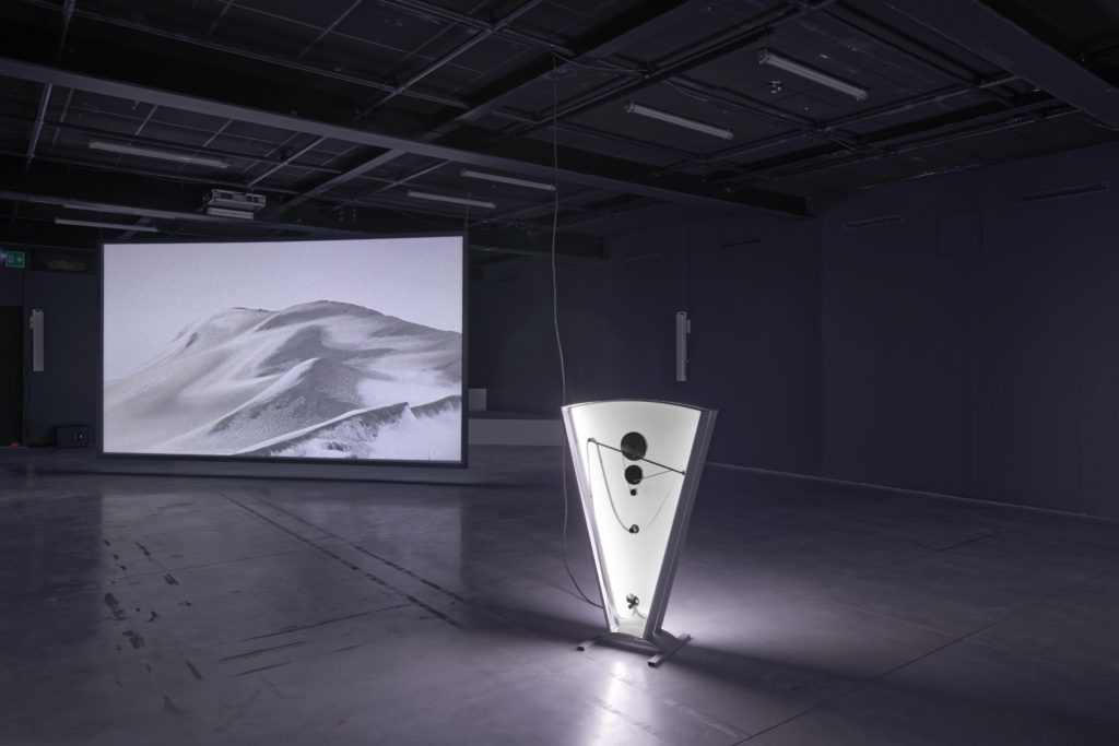 L’artiste a souhaité ouvrir l’espace de la galerie noire sur les grandes fenêtres des galeries transparentes qui entourent le bâtiment, pour souligner cette sorte de confluence entre la réalité et la fiction. Les paysages projetés par les quatre films diffusés sur les écrans étant ainsi confrontés au paysage extérieur afin de créer un dialogue poétique et brouiller les repères. Le film Inside the outset : evoking a space of passage qui ouvre le parcours est tout récent et a été réalisé à Chypre suite à une invitation du Point Centre for Contemporary Art de Nicosie. Il est à la fois constitué d’images aériennes et d’images sous-marines, mêlant archives et nouvelles prises de vues réalisées pour l’occasion. Le film souligne la complexité de toutes les strates de cette société chypriote suite au conflit de 1974 et la transformation du territoire, à partir d’une sorte de retour dans le passé. Cette civilisation a été très importante, ce dont témoignent certains vestiges grecs sous-marins même si les paysages actuels portent les stigmates des différentes tensions géopolitiques. L’artiste a imaginé dans cette zone tampon entre les territoires grecs et turcs protégée par l’ONU, un grand théâtre en plein air, ce que reprend la scénographie générale de l’installation avec deux bancs en arc de cercle. Elle est partie de matériaux récoltés sur place et non exogènes pour aboutir à un geste qui se fonde dans l’environnement. L’écran de cinéma laissé sur place pourra continuer à être utilisé par des associations ou curateurs afin de réunir la population qui peut aussi s’y retrouver pour échanger et passer du temps. L’idée étant que cette structure naturelle soit laissée à la dégradation des éléments pour revenir au paysage qui l’a vu naître.