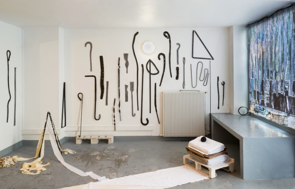 Ce qui était intéressant pour moi était d’exposer dans l’espace de l’atelier. Un espace qui infuse les œuvres, que j’appréhende comme un paysage quasi organique où les choses se sédimentent, changent… De plus cette exposition Matter of Present répondait à l’exposition de mon diplôme de DNSAP -Beaux-Arts (avec félicitations du jury ndlr) intitulée Table des matières. L’atelier de la Cité des arts situé sur deux niveaux avec de très grandes fenêtres que j’ai voulu flouter à partir de grands panneaux de tissus. Ces panneaux sont créés à partir de photographies travaillés en patchwork. Des outils forgés sont suspendus devant comme la réminiscence de la main, du processus, de la matrice. Des superpositions omniprésentes dans le travail, chaque strate révélant une nouvelle histoire. Toutes les chutes par terre renvoient à d’autres sculptures. Les outils au mur dessinent comme un alphabet de formes, leurs ombres aussi là ou l’outil a disparu. L’œuvre Between Lines est la synthèse parfaite de mon processus, presque comme une cartographie mentale, avec cette confrontation radicale entre le métal, résistant et le papier, a contrario périssable.