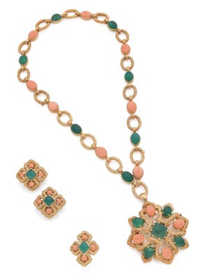 Parure « Delphes » en or jaune 18k, corail et chrysoprase composée d’un collier pouvant former 3 bracelets, d’un pendentif, d’une bague et d’une paire de clips d’oreilles, vers 1970