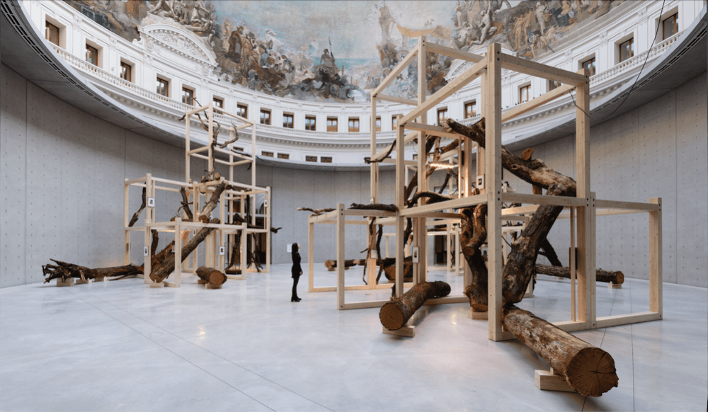 Pour la rotonde, le jardin sombre de Danh Vo plante magistralement le décor avec cette forêt meurtrie lors des tempêtes, dont les branches tortueuses soutenues par ce qui ressemble à des béquilles, s’élancent tant bien que mal vers la coupole et sa célébration des denrées coloniales. L’artiste d’origine vietnamienne a connu le déracinement forcé et l’exil. Sa compatriote Thu Van Tran se saisit aussi de cette histoire pour une intervention in situ d’un chromatisme plus doux mais dérangeant avec ces tâches et couleurs violacées issus de résidus de caoutchouc qui contaminent les murs à l’instar des stigmates des prédations de l’Occident.