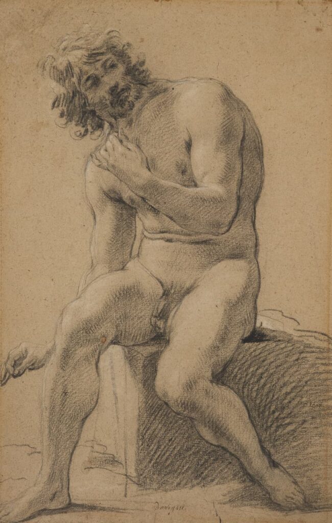 Pierre noire et rehauts de craie blanche sur papier beige, DE BAYSER