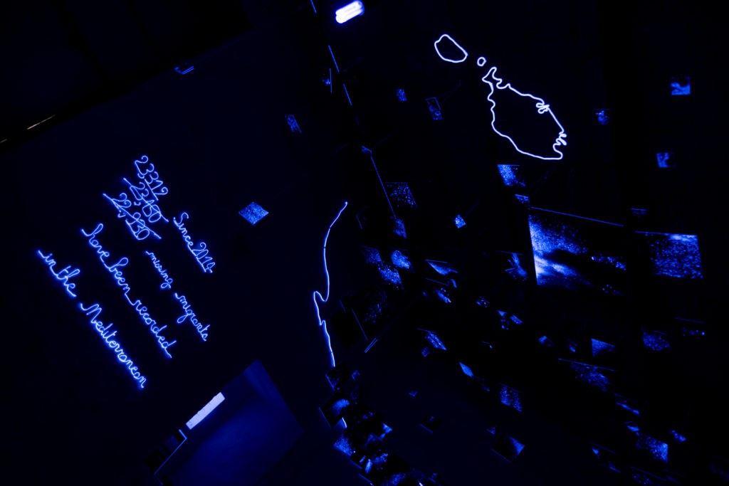 Katel Delia dans l’installation immersive et sonore The Last Breath plonge le visiteur dans une nuit de traversée en Méditerranée. L’artiste est partie des données du projet « Migrants disparus » de l’Organisation internationale pour les migrations (OIM) pour ses photographies proportionnelles au nombre de personnes mortes ou disparues pour les années 2014, 2015, 2016.