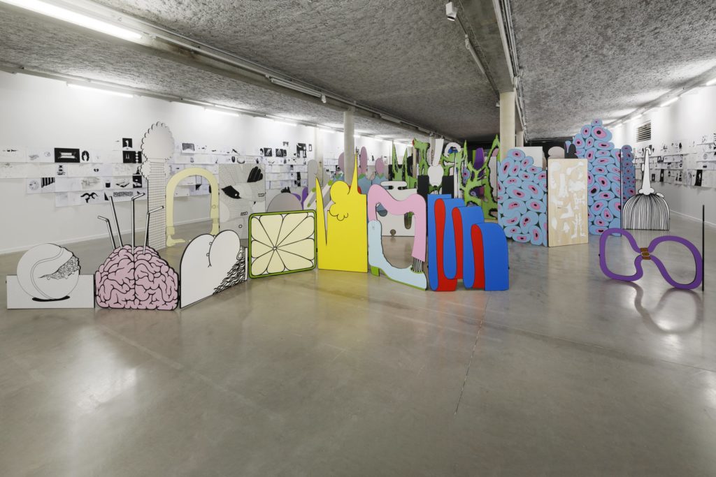 Spectaculaire moment avec Anthea Hamilton, descendante afro-caribéenne qui mixe les références de la culture populaire occidentale et africaine entre motif de tartan écossais (le Hamilton), papillon géant et femme yéti issue de la pensée fétichiste de Robert Crumb. Autres allusions racistes avec l’installation de Jean-François Boclé « Consommons racial ! » un alignement de produits alimentaires dont les emballages renvoient à une vision discriminante de la société. Une enquête que l’artiste a réalisé en Colombie à partir de la marque la Negrita qu’il trouve à Cali. En face la cabine de Nathalie du Pasquier renvoie à la très belle exposition du Mrac de 2022 par Clément Nouet. Elle est conçue de façon à pouvoir accueillir d’autres oeuvres comme une peinture de l’activiste britannique Lubaina Himid à partir du motif traditionnel du Kanga, pièce de coton où le texte le dispute à l’image. On se souvient de l’exposition de Sandra Patron en 2018 de l’artiste, lauréate du Turner Prize « Gifts to Kings ».