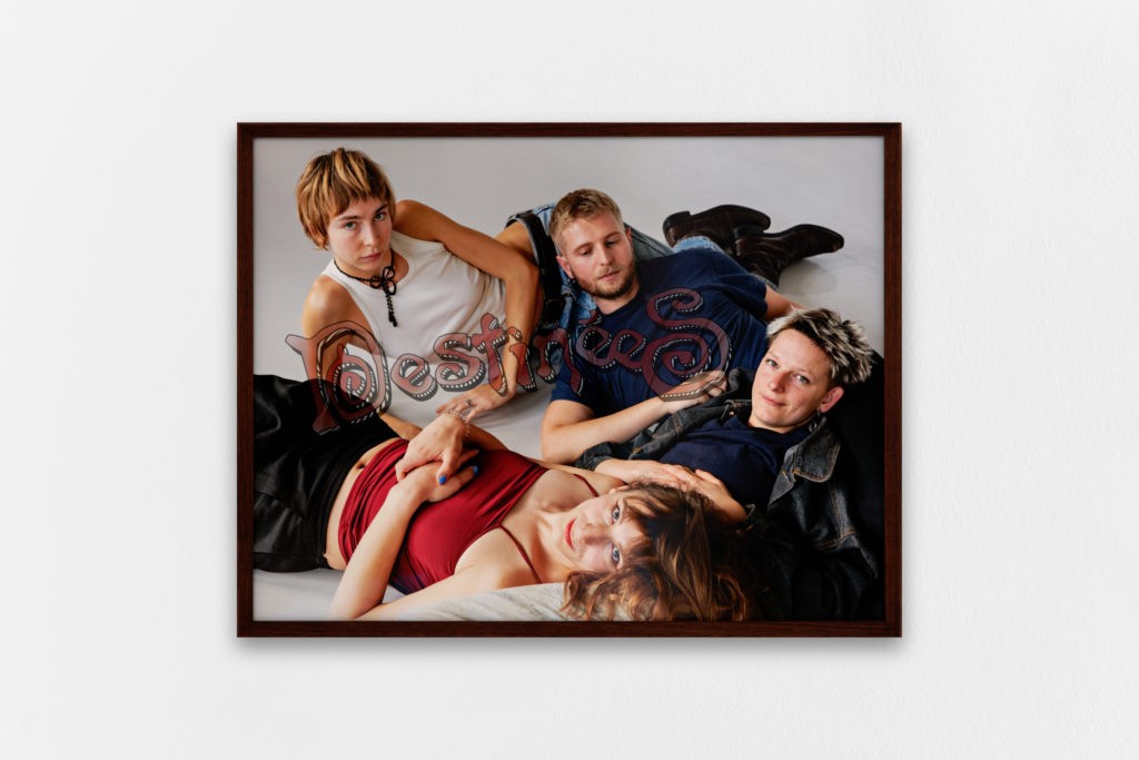 Ensuite je suis tombée par hasard sur un article d’un certain Emile Rubino sur l’exposition Edouard Merino chez Jan Mot à Bruxelles. C’étaient des œuvres de Philippe Thomas signées du nom du collectionneur qui les achète. Ce jeune artiste est à la fois photographe, critique d’art et organisateur d’expos. Je lui propose donc à la fois de faire une commission sous la forme d’un portait des artistes de l’exposition et d’écrire le texte d’accompagnement. Etant donné qu’il a une exposition personnelle à KIOSK en Belgique, il accepte seulement le portrait de groupe. Les artistes sont tous venus de Suisse, de Belgique, de Marseille.. pour cette prise de vue.