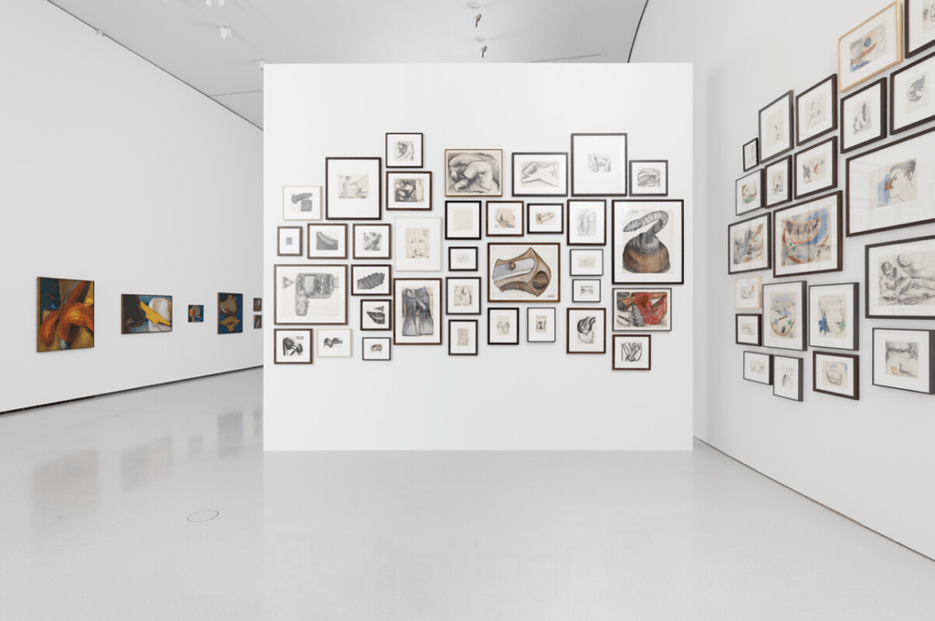 Accents surréalistes, imagerie sexuelle et slogans explicites évoquant les publicités se superposent dans ses dessins, mettant ainsi l’accent sur le rôle actif du langage dans son travail. Aux alentours de 1963, Lozano commence à réaliser la série Tools dans laquelle marteaux, tournevis et machines deviennent les sujets d’huiles sur toile grand format picturales et d’une puissance extrême. L‘exposition invite aussi à découvrir la série Airplanes dans laquelle des objets volants entrent en interaction avec des orifices humains. En 1965, Lozano se tourne vers l’abstraction avec une série de peintures monumentales auxquelles une salle est consacrée, salle où est également exposée une rare sélection de dessins préparatoires. Les Language Pieces, œuvres basées sur des textes et datant de la fin des années 1960 et du début des années 1970, terminent l’exposition en présentant son évolution vers une pratique entièrement conceptuelle. Cette phase de son travail décrit la nervosité ressentie par Lozano à l’égard de toute forme de pouvoir institutionnel, tendance dont le point culminant fut sa décision d’abandonner purement et simplement le monde de l’art en 1972.