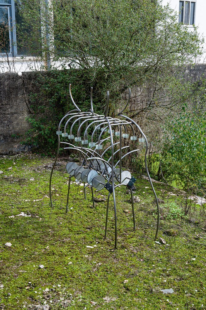 J’ai une pratique de sculptures et d’installations principalement auxquelles s’ajoutent et selon les projets du son et de la vidéo. En ce qui concerne les matériaux, j’utilise surtout du métal, acier et inox. J’aime particulièrement faire passer des flux à l’intérieur impliquant de l’image, du texte généré par algorithme ou de l’eau mais aussi du mouvement. Tous ces éléments finissent par s’imbriquer pour questionner notre rapport aux nouvelles technologies et aux croyances qui en découlent.