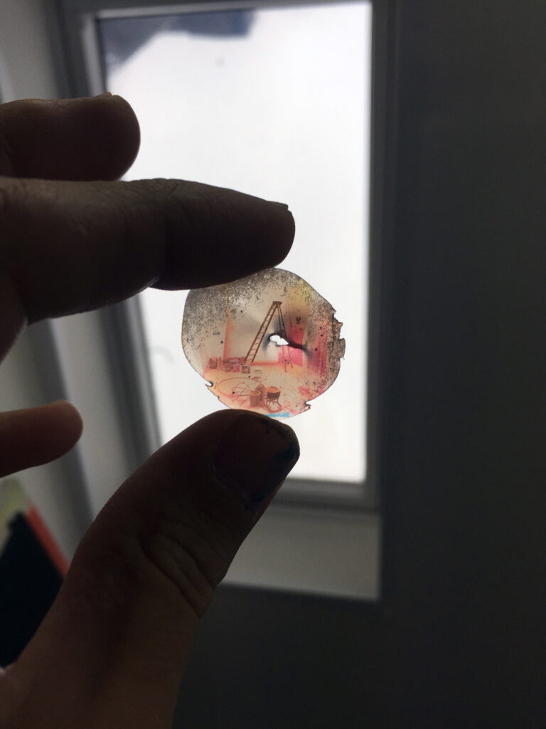 La porosité et la fragilité des matériaux est ce qui intéresse l’artiste dans une interrogation autour de la nature de l’image. Une dialectique engagée avec la peinture, la pellicule ou le verre jusqu’à réduire à la taille d’une lentille des scènes d’archives, des paysages ou des souvenirs personnels. L’opacité ou la transparence, la soustraction ou le recouvrement, l’abstraction ou la figuration sont parmi ses paramètres d’expérimentation. Damien a répondu à mes questions.