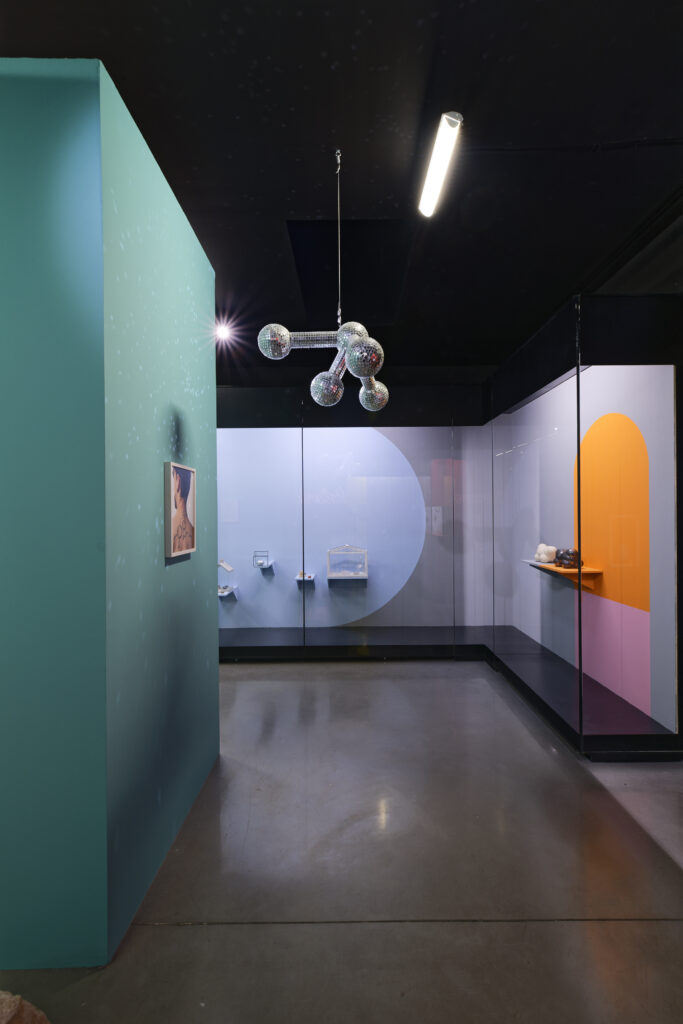 Je montre aussi deux nouvelles céramiques dont chaque forme est la matérialisation de la formule chimique de l’éthanol. Elles font échos aux Disco ball, des boules à facette sous forme de molécule qui questionne la prise de substances ainsi que la puissance de la danse – capable de les remplacer ?