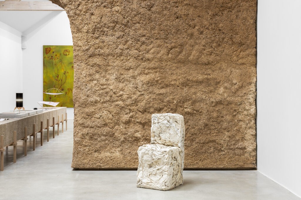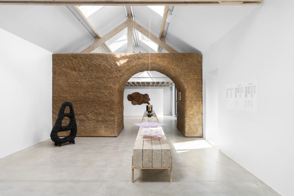 Nous avons également invité le jeune collectif bruxellois Bento Architecture (co-commissaire du Pavillon Belge de la Biennale d’Architecture de Venise 2023) à concevoir une éco-scénographie en béton de chanvre. A partir de matériaux naturels et sourcés localement, ils proposent une scénographie entièrement compostable à l’issue de l’exposition et dont l’installation a été permise grâce à un chantier participatif favorisant l’insertion professionnelle.