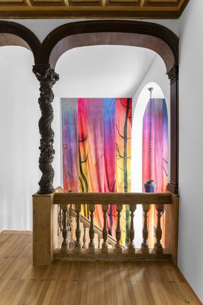 L’artiste textile Adélaïde Feriot, résidente à POUSH et qui travaille le velours peint, s’est notamment inspirées des feux de forêts en Gironde, sa région natale, pour concevoir une installation monumentale dans la cage d’escalier : trois panneaux de velours peint se déploie et reprennent les motifs des arbres en feu d’après d’images qu’elle a prises avec son téléphone. Le feu étant à la fois symbole de destruction et de régénération, cette œuvre fait le lien dans le parcours entre le rez-de-chaussée orienté vers le design de solutions et le premier étage qui investigue nos relations aux non-vivants, aux gestes et à la matière.