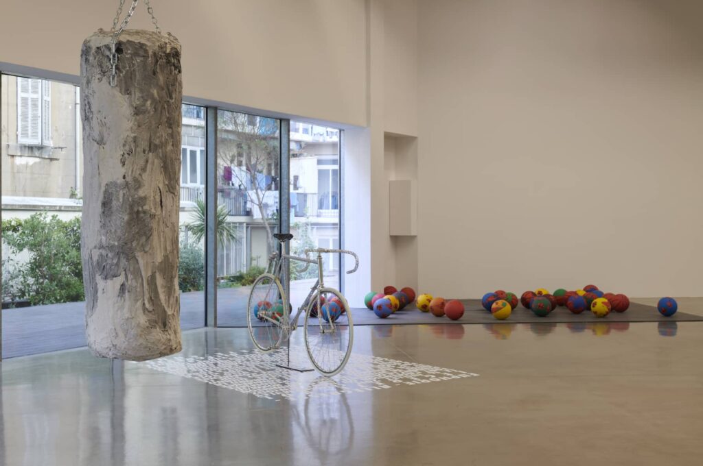 ME. Le commissaire général et scientifique de l’exposition Jean-Marc Huitorel a porté le projet et le choix des artistes avec le souhait de créer une articulation entre les 3 lieux autour d’artistes que l’on peut retrouver à plusieurs reprises comme dans certaines biennales. C’est la nature très différente des lieux et institutions qui ont aussi guidé aussi le commissariat Jean-Marc. Le mac avec ces grandes galeries d’exposition permettait le déploiement de formats tableaux et d’explorer la manière dont les peintres ou dessinateurs se sont emparés du sujet sportif, le Frac Sud dans une configuration plateau qui a permis de jouer des interactions sur le mode d’installations assez généreuses et monumentales et le Mucem (Fort Saint Jean) autour de l’objet vernaculaire du sport qui rejoint l’objet travaillé par l’artiste ou détourné.